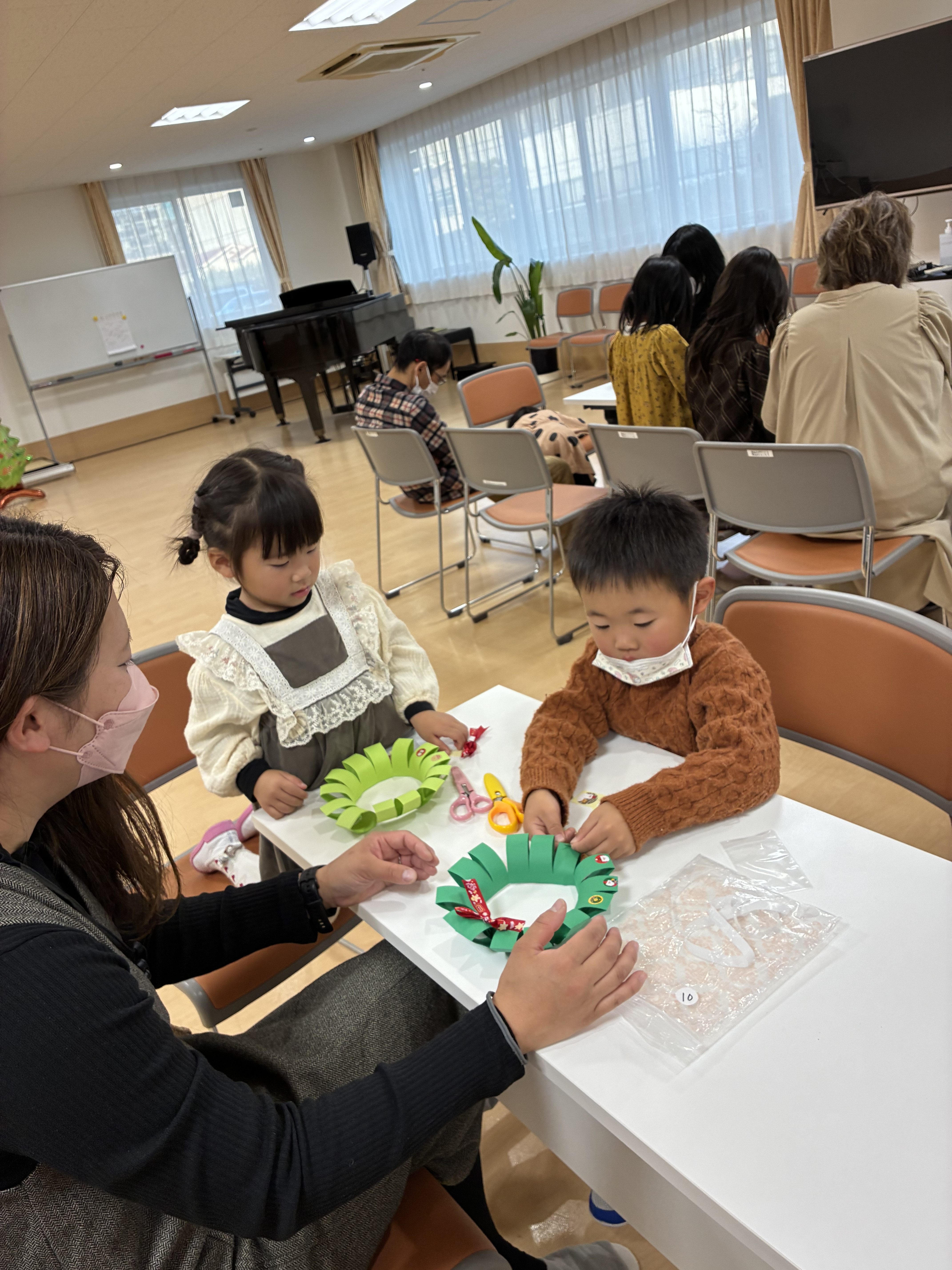 制作は『クリスマスリース🎄」ハサミ✂️を使用し、指先もしっかり使います。